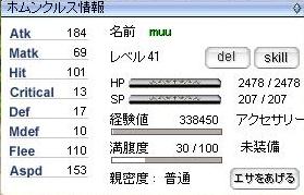 ニコマスタのチキンたんと一緒にした方が 比べやすいかな?と思い、同じLvにしてみました。 経験値や満腹度まで一緒なのはたまたまですw チキンたんのステ用スキンかわいいなぁv 私もホム用のスキン探そうかな・・・(´¬`*) なんか・・・うちの子・・・ きのこばっかり食べてるから発育不良!?Σ('ー';≡;'ー') 右は龍の城に突然生えてたきのこたちw MAPを1周して戻ってきたらもうなかった・・・。 HitとかFleeとかよわよわですね; かろうじてSPとAtkとCriticalですか?(´・ω・`)イラネ・・・ ホムステを自分で振れないところが痛いですな・・・。 まぁだから他の人と同じにならなくて面白いのかな? ホムステ逆算機によると <muu Lv41> STR 59 AGI 69 VIT 11 INT 33 DEX 60 LUK 36 です。 どんな子に育つのか楽しみですね♪ヾ(*´∀`*)ノ そして。 夕方からはクエストばっかりやってました~。 ソロでLvがなかなか上がらない(´;ω;)ので クエストで経験値を獲得しよう!と思い、 アインブロックの「工場クエ」と「シドクスクエ」を済ませ、 リヒタルゼンの「大統領クエ」をやりはじめたのだが・・・ 生体Dで死にまくって、「ユミルの心臓の集積体」が 手に入りませんBOSS!!。・゚・(ノД`)・゚・。 死んで経験値減っちゃ意味ナイよ~!>< 結局、護衛3人に助けてもらって、なんとかGETできました☆ 手伝ってくれた方々ありがとうね~♪(*´∀`人 経験値は、羽華Lv78 Base1.5%→77.5%まで増えました♪ よし。パンダカートまで@Lv2と22.5%だ! がんばろう~☆o(*`ω´*)o ☆おまけ☆ りんごさんときゃびあたんがたまり場に遊びに来てくれたよ♪ ムウ・・・ちょっと照れてる!?(*ノ∀`*) |