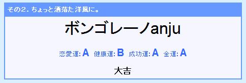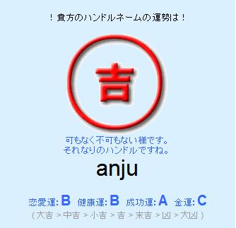 (´・ω・`) それなりのハンドルかぁ・・・ ・ ・ ・ あっ Σ( ̄□ ̄; _| ̄|○ il||li レア運ないのって 名前のせい だったのか!? (;ω;)<夫が稼いでくれればいいもん… ここでは親切に 改名案 をあげてくれます。 ボンゴレーノ! σ゚д゚)ボーノ!ボーノ! ん?・・・ボンゴレ?・・・リボーン!?(ぇ ディーノ さぁあああああああああああああああん!(´∀`*) (違 ・・・ 違うキャラも占ってみました。 天禅・・・小吉 「中途半端に良いです!更に運気を高めるなら改名をしましょう。」 中途半端って・・・。 ☆大吉改名→「まったり天禅」「天禅大特価中」 羽華・・・吉 「可もなく不可もない様です。それなりのハンドルですね。」 anjuと一緒。(´・ω・`) ☆大吉改名→「羽華将軍」 迦夜・輝也・アンドレア・・・大凶 「( ̄ロ ̄;ガーン ご愁傷様です。すぐに改名する事をオススメします。」 ガ━━(;゚Д゚)━━ン!! ☆迦夜・中吉改名→「ペペロンチーノ迦夜」「迦夜★ひろ」 大吉改名なかった・・・orz ☆輝也・大吉改名→「輝也。」「輝也大佐」 ☆アンドレア・大吉改名→「カルボナーラアンドレア」 運に見放されたキャラばっかりでした・・・。・゚・(ノД`)・゚・。 でも改名するのは イヤ です(・∀・;) 運なんかなくたっていいやい!ヽ(`Д´)ノ ・・・とか言いつつ、大吉案で露店とかしてても笑わないでね?(*ノノ) みなさんもやってみては?ヾ(・ω・)ノ゙ 大凶仲間募集w ハンドルネーム占い http://www.hname.net/ PR